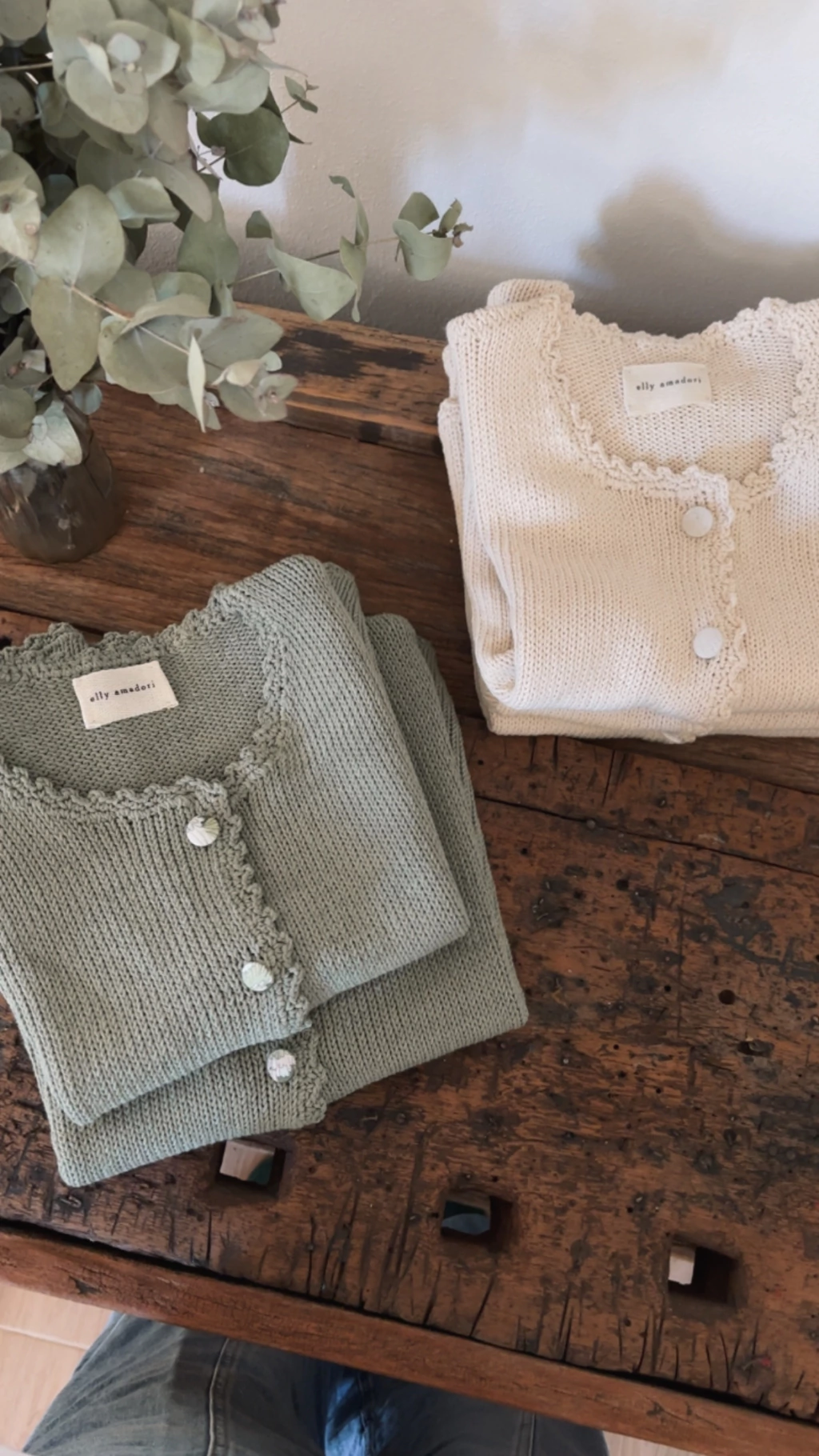 Top/chaleco de hilo de algodón tejido a maquina manual en punto jersey, con termicación a crochet en todo el borde. De corte cuadrado, tipo musculosa con botones forrados en delantero.
